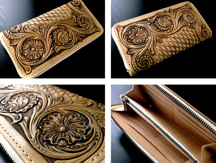 日本製ハンドメイド 長財布 ラウンドファスナー ≪CHAOS カオスオリジナル シェリダンクラフト ラウンドファスナーウォレット ファスナーカラー/ホワイト ロングウォレット 手彫りカービング≫北米産ベンズサドルレザー姫路なめしバット判 財布 本革【送料無料】