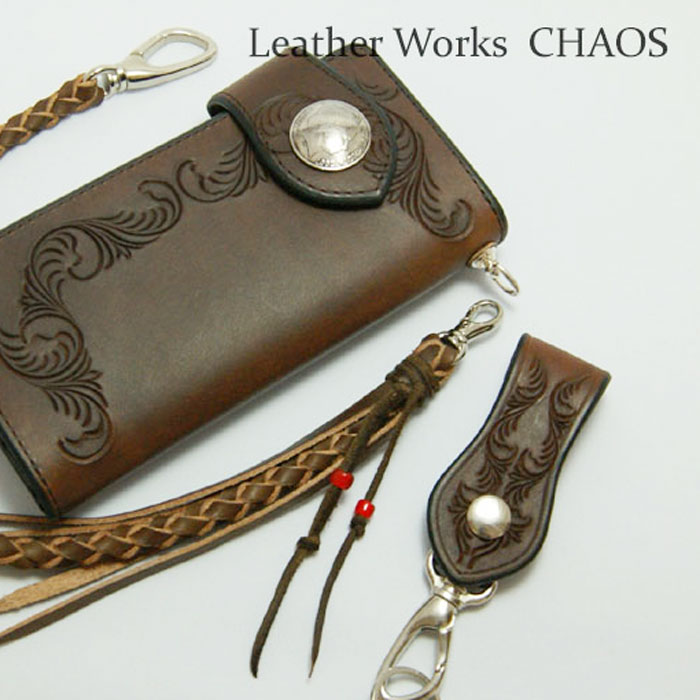 ロングウォレット 【送料無料】【サドルレザーブラウン茶色】 ハンドメイド 北米サドル使用 【レザーワークスCHAOSオリジナル【カービング重ね彫りフェザーカット】【バリーキング深彫り】【ウォレットチェーン、ベルトループB付き】[本革] 長財布